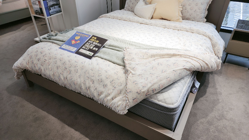 시몬스 침대에서 본 메인 제품인 헨리 매트리스입니다. 위 사진에서 보듯이 거의 모든 침대가 침대 발끝에 발판이 있어서 누워서 체험해봤습니다. 카사미아와 일룸은 별 차이가 없었는데 이상하게도 시몬스가 좋다고 느꼈습니다. 헨리의 제품은 온라인 구매가 어려운 것으로 알려져 있다. 헨리보다 한 수 위인 재스민은 가끔 온라인에서 판매한다. 자스민 매트리스는 매장에 없었습니다.
